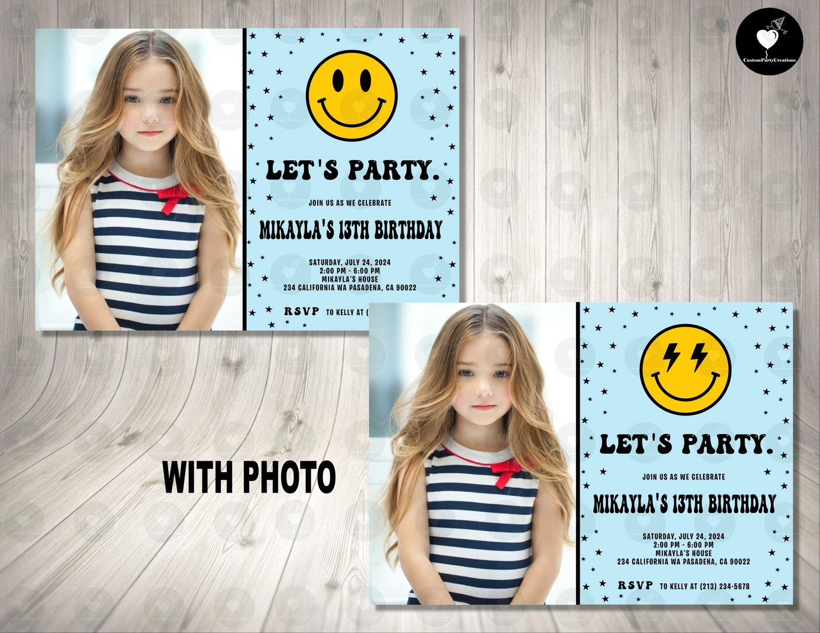 RUSH MY ORDER – Blue Smiley Face Invitation Birthday Party