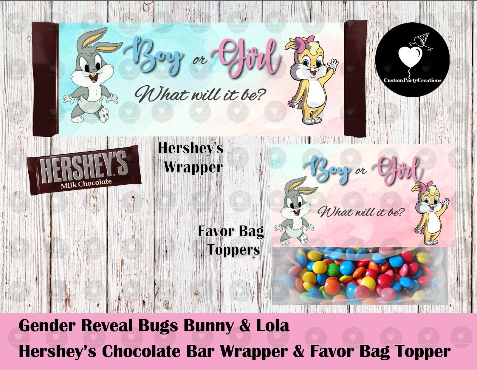RUSH MY ORDER – Bugs and Lola Gender Reveal Hershey’s Wrapper and Favor Bag Toppers