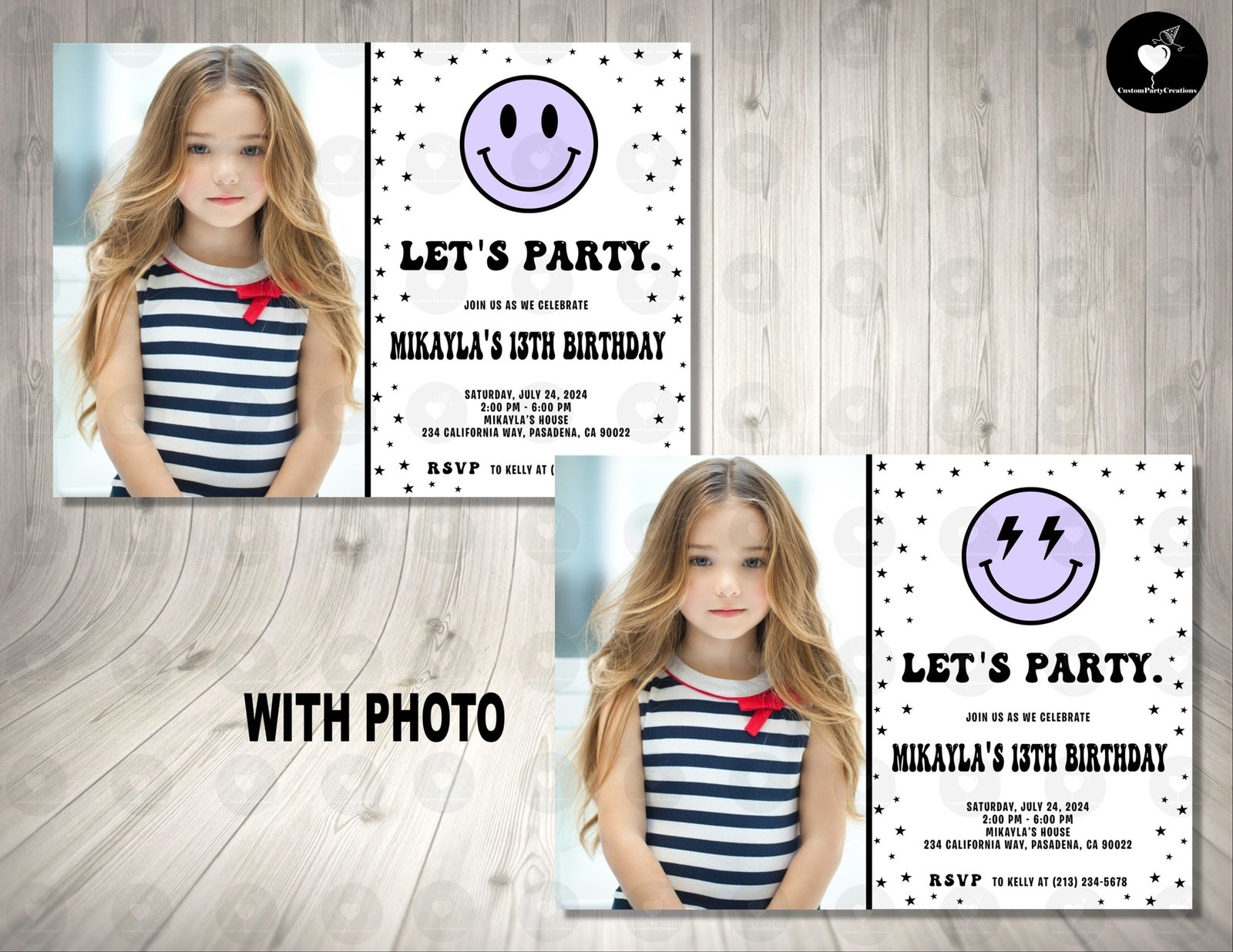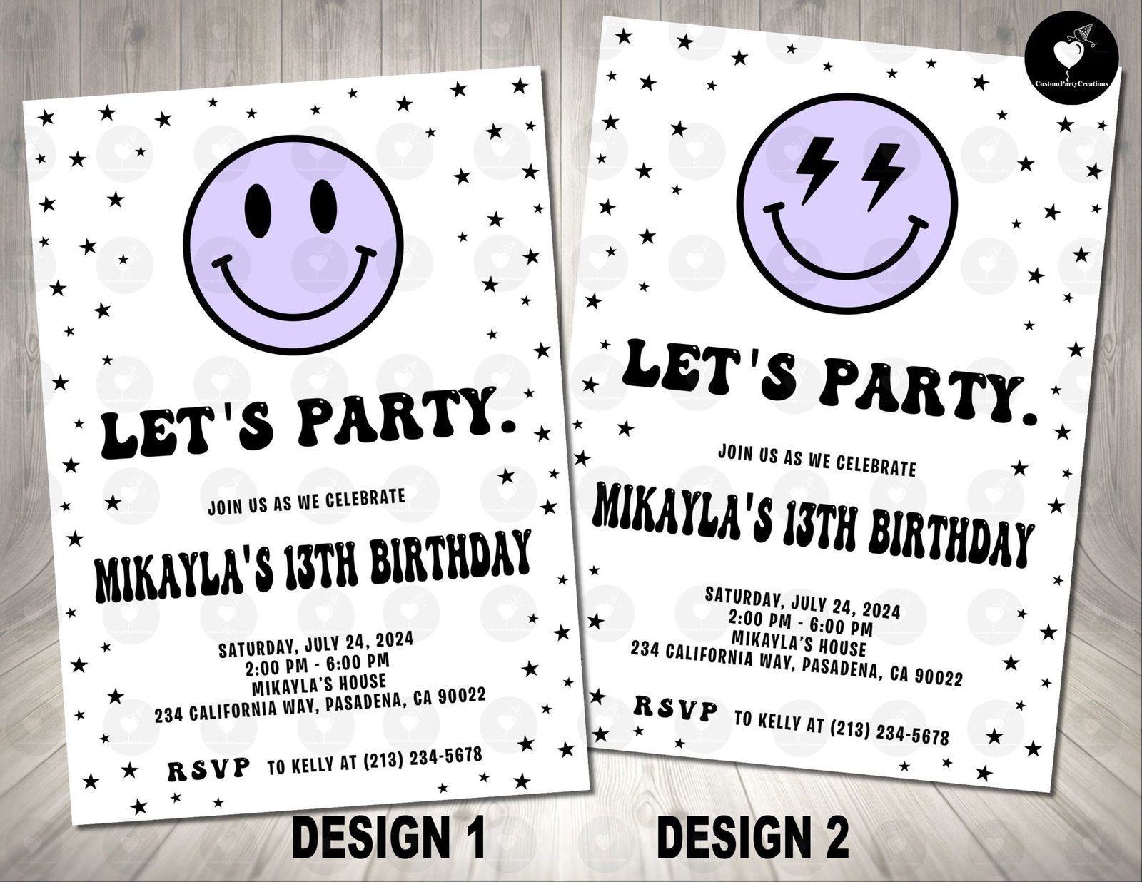 RUSH MY ORDER – Purple Face Smiley Face Invitation Birthday Party