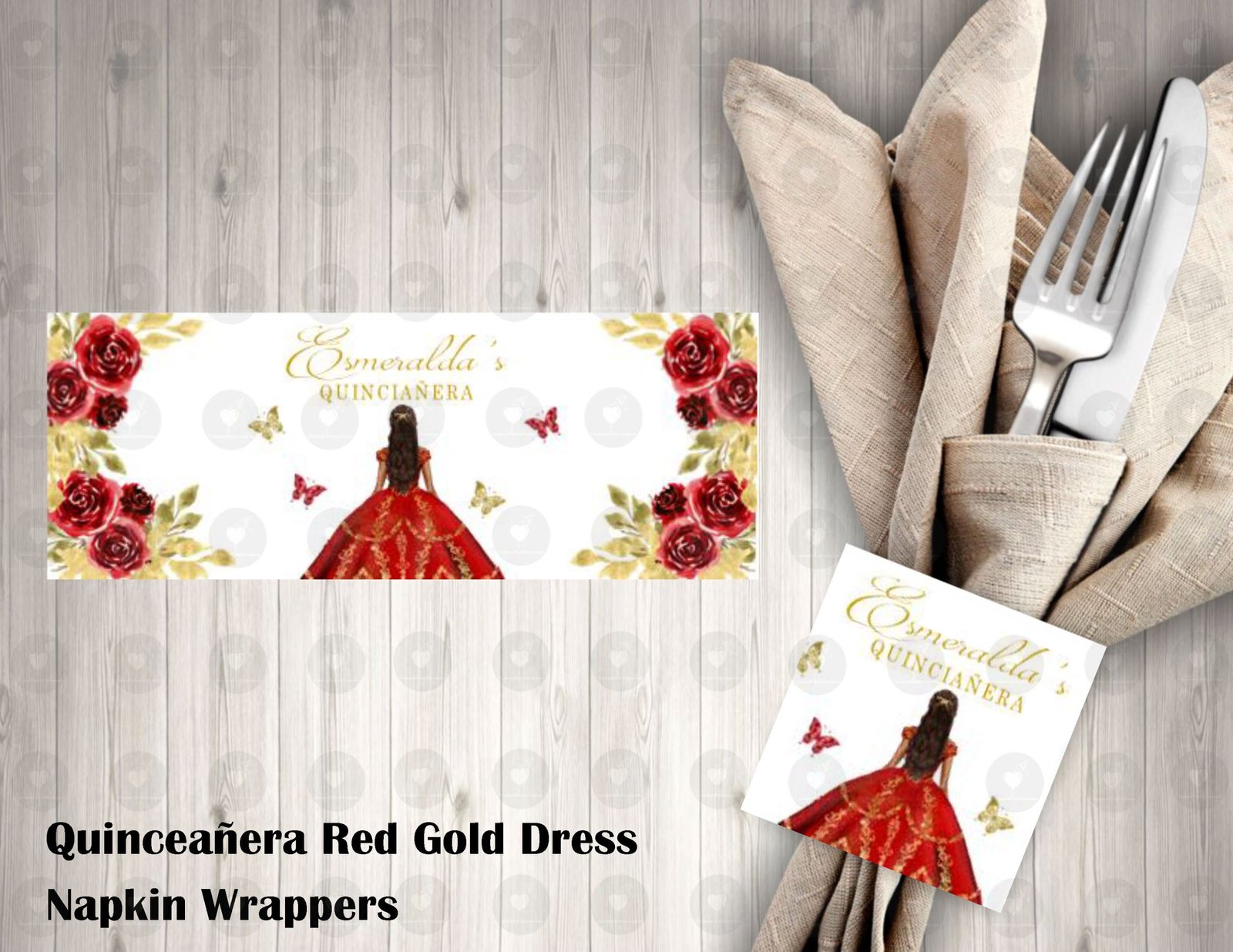 CUSTOM DESIGNS – Red Gold Floral Princess Quinceanera 15th Birthday Sweet 16 Napkin Wrappers